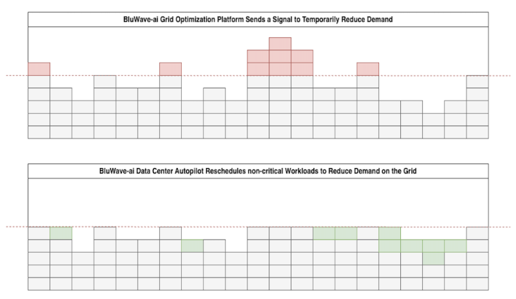 To meet this need, BluWave-ai provides the Data Center Autopilot, a software-as-a-service product using patent-pending technology. It provides application owners, colocation and hyperscale data center operators with a fast-to-deploy solution to manage their immense and volatile power demands in concert with the dynamics of the local grid load. The Data Center Autopilot realizes this by moving tasks that can be scheduled to operate at times where grid congestion and energy costs are lower, smoothing out “spiky” AI workloads while maintaining quality of service and uptime.