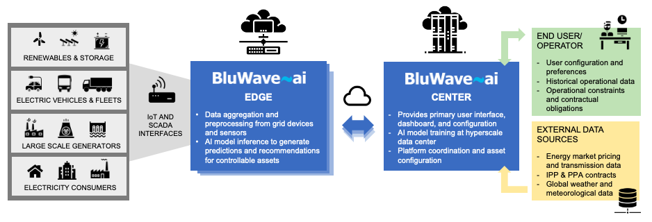 BluWave-ai Edge collects and pre-processes real-time IoT sensor and meter data from the microgrid site. AI models use this plus weather data and other signals to perform load and generation predictions. Optimizers provide recommended dispatchable assets, such as energy storage, to meet operational goals in energy cost and emission reductions.